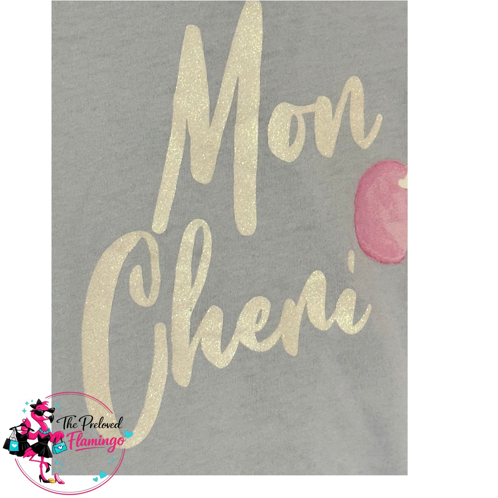 Super cute 2-piece pyjama set from F&F. Includes a light blue oversized t-shirt with a glittery “Mon Cheri” cherry slogan and matching gingham trousers featuring a sweet cherry pattern. Perfect for lounging!