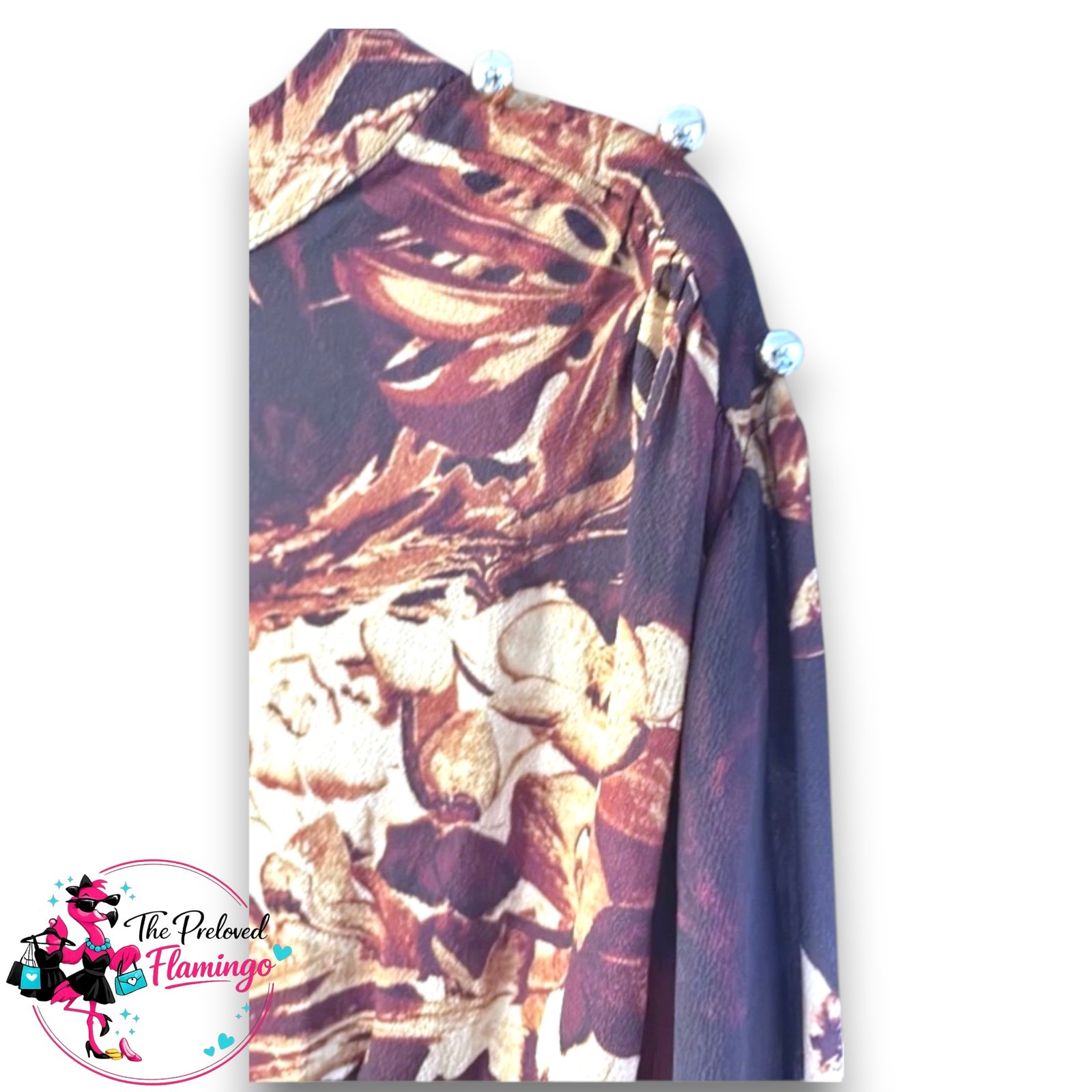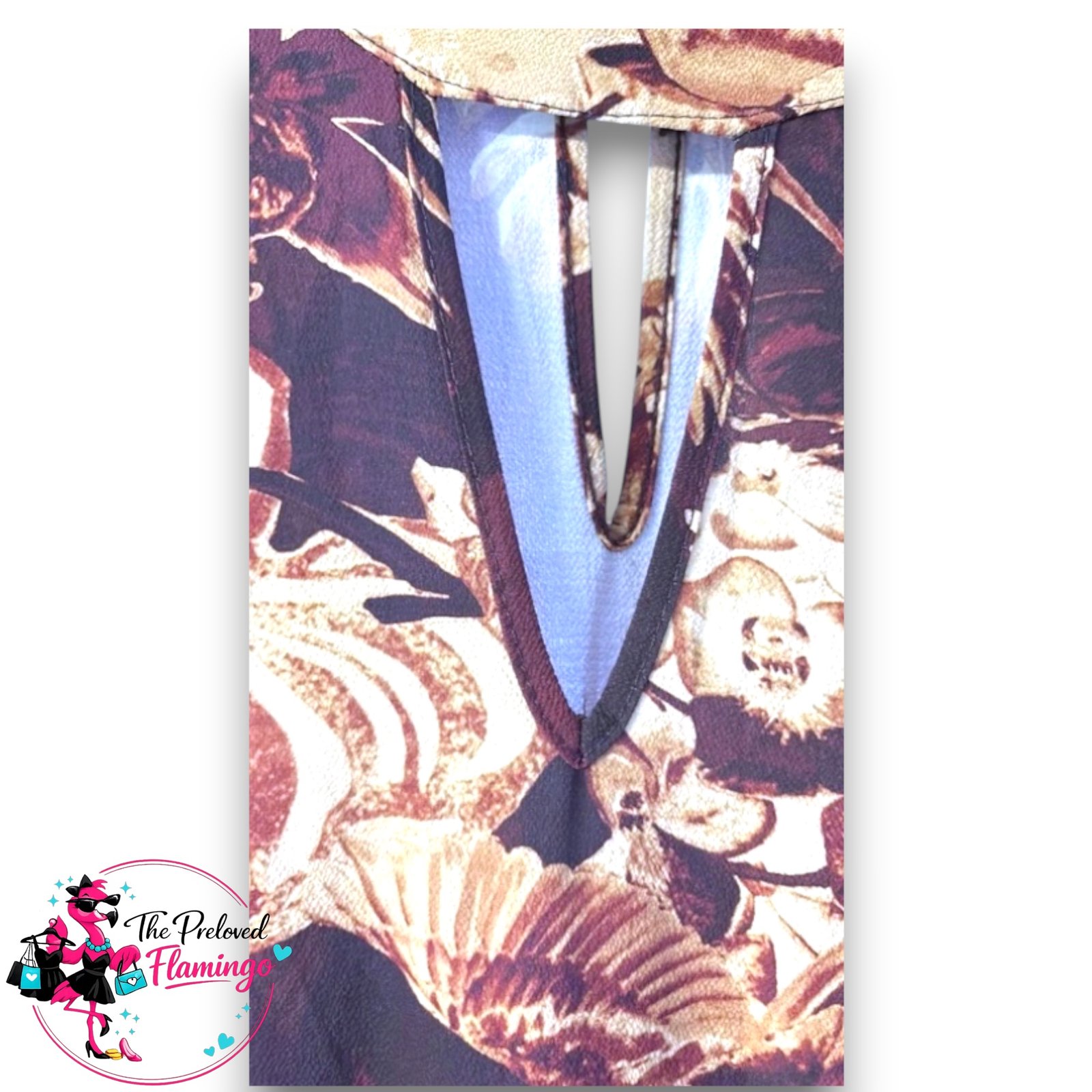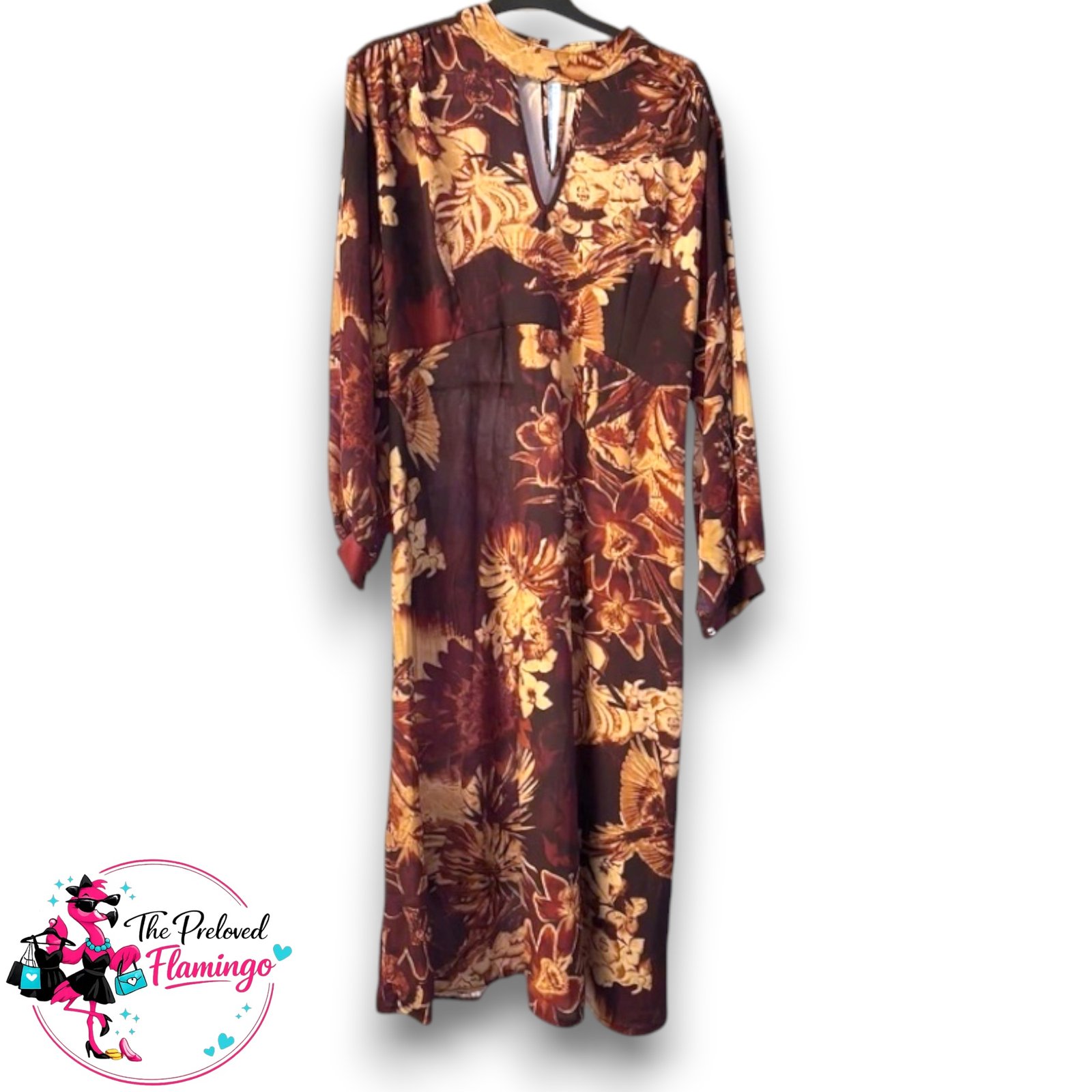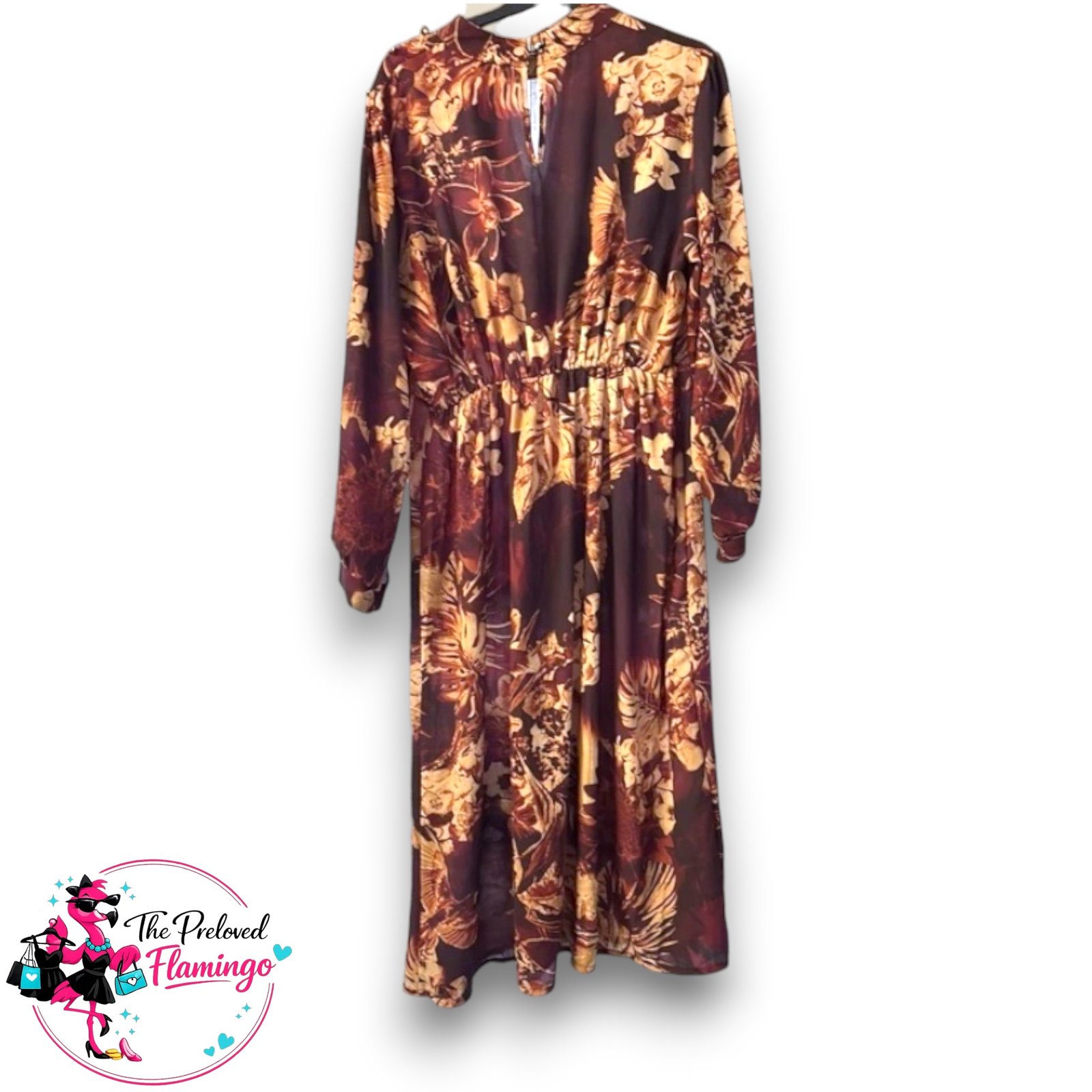 brand new “Made in Italy” midi dress. Featuring a beautiful, rich botanical print in deep burgundy, rust, and cream tones.