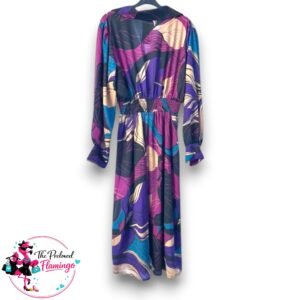 F Fashion, Abstract Print, Purple Dress, Teal Dress, One Size, UK 16, UK 18, BNWT, Shirred Waist, Long Sleeve Dress, Occasion Wear, Wedding Guest, Bold Print, Boutique Dress